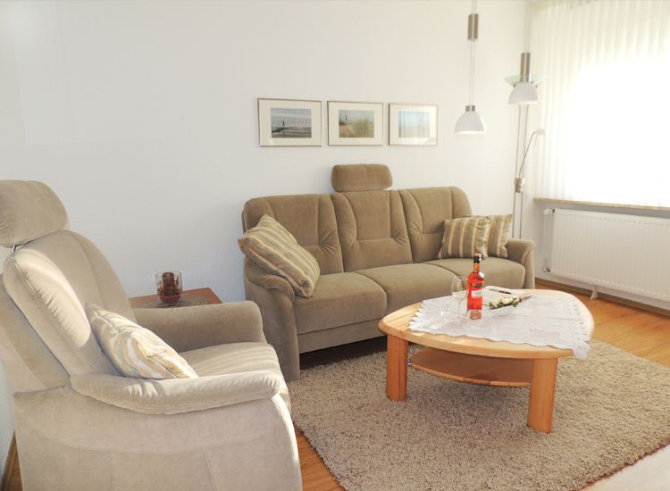 - 1 Wohnzimmer mit Polstergarnitur, SAT-TV und einer Auswahl an Büchern